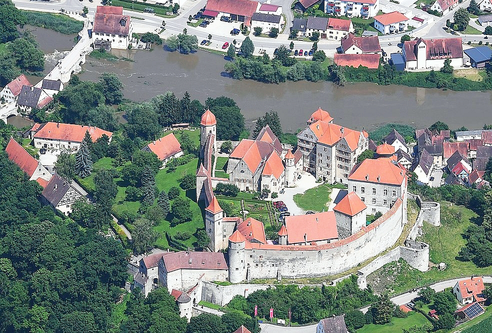 Using the overhead photo of the castle below, next door to the palace complex on the western side there is a large building called the Great Hall where no doubt the public business of the castle’s noble family would be carried out. On the opposite side of the courtyard there is the castle’s church. Behind the church on the river side of the castle courtyard there is a viewing platform with amazing views down on the small town of Harburg and along the river valley.