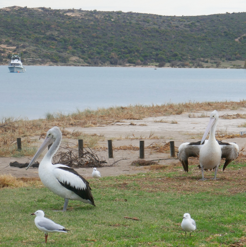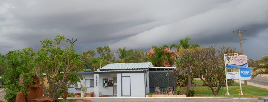 After we turned off the Northwest Coastal Highway onto the Ajana-Kalbarri Rd, it was a lovely drive into Kalbarri. Our home for the next three nights was recorded online as being the Murchison River Caravan Park. The first Caravan Park we pulled up at was simply called the Murchison Caravan Park. When I went into the office, I asked the receptionist if this was the Murchison River Caravan Park? She said it was. I replied, “What happened to the ‘river’ in the title?” She smiled, but the guy out in the back office called out, “We couldn’t afford the extra word!” I knew I was going to enjoy this Caravan Park, particularly as I had read it was opposite the pelican feeding spot on the bank of the river where these birds were fed each day by volunteers. There weren’t that many pelicans around that afternoon as the sky had turned dark and we were treated to the first rain-storm of our holiday.