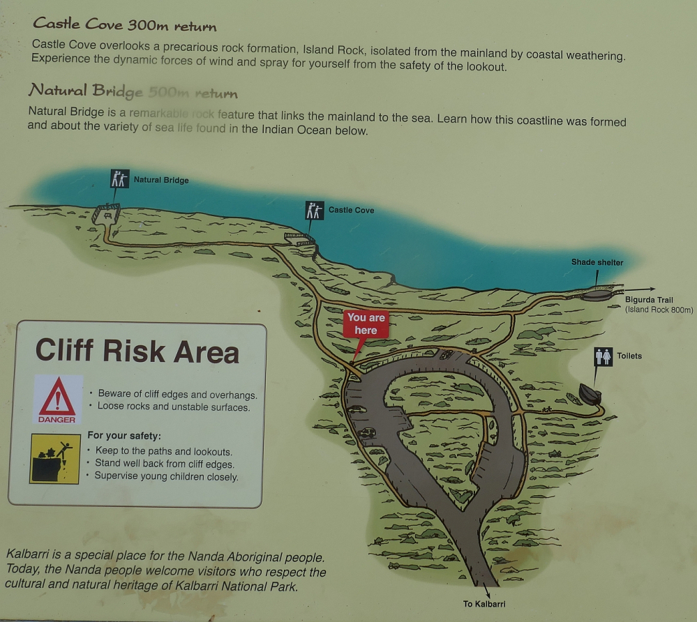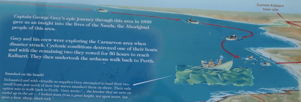 Apart from the information board below telling the story of Captain George Grey, there were also other boards telling the tale of the wreck of the Dutch ship in 1712, the Zuytdorp, which ran into the cliffs north of Kalbarri and gave its name to the long line of cliffs that run all the way to Dirk Hartog Island. We encountered this story again when we visited the impressive Museum in Geraldton; the details can be accessed here.