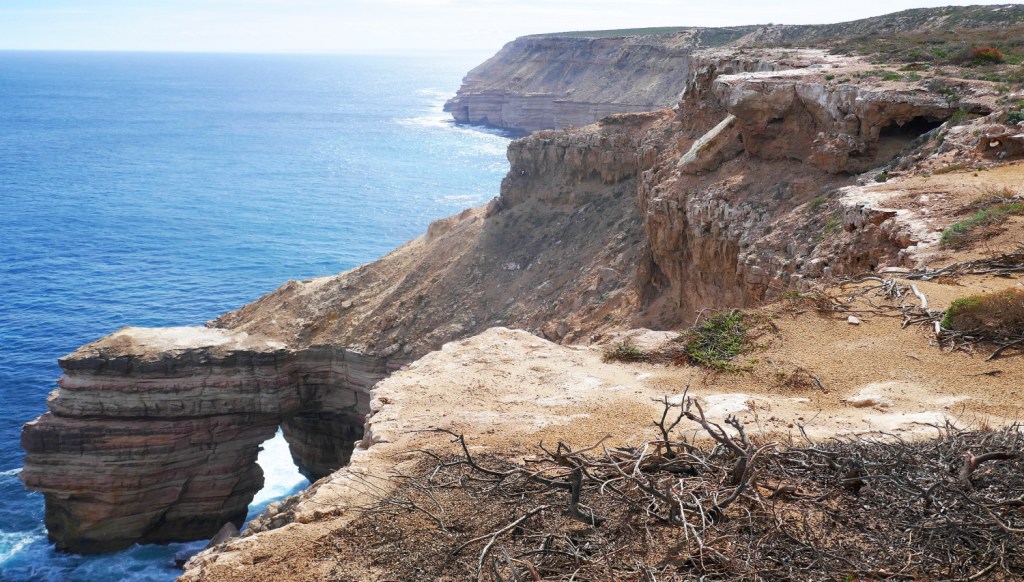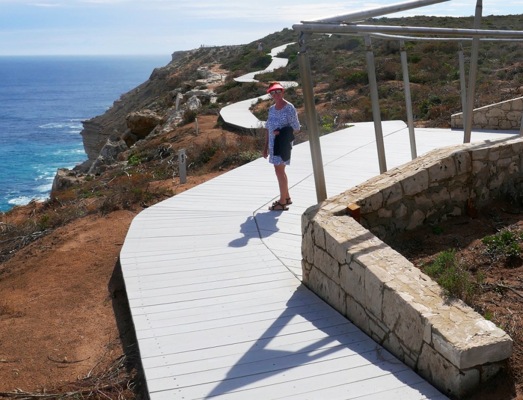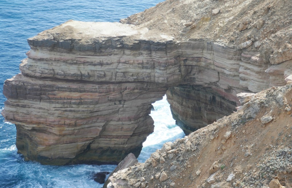 Our first full day in Kalbarri was devoted to exploring the extensive sea cliffs that Kalbarri is famous for. Given the nature of cliffs, we didn’t think that the recent cyclone could interfere with our inspection of such ancient landforms., but human infrastructure is a different matter. The first problem the recent cyclone caused cliff-visiting tourists was to blow over many of the signs pointing towards our sightseeing spots along George Grey Drive. The important turnoff to Shellhouse Grandstand, Island Rock and Natural Bridge was still completely bent and twisted over so we sailed right past it. We realised 10 km later that we must have missed the turnoff. The quality of these three scenic spots made us quickly forget the delay. As usual, the quality of the Information Boards impressed us; the National Parks authority clearly has some impressive artists and designers working for them to ensure visitors knew exactly what they were looking at. There was a well maintained car-park with a 1.2 km return stroll along the boardwalk to view the Natural Bridge. While we were at the viewing platform, another bonus feature of having a fabulous lookout on the Kalbarri cliffs appeared…the sight of whales breaching out to sea.