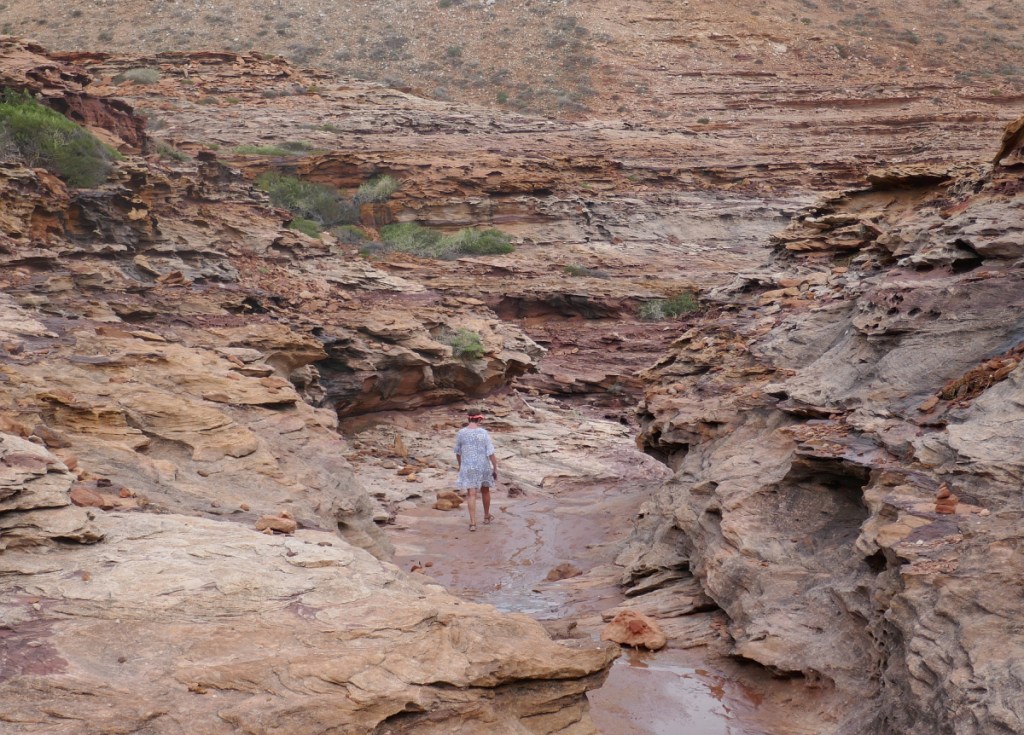 We headed back to the car sensing that if our first three sea-cliff sites were anything to go by, we were in for a great morning of cliff walking. However, the cyclone of the previous month was intent on limiting our day as when we headed back towards Kalbarri town, the next turnoff to Eagle Gorge was closed by council barriers. Our next turn off was to Pot Alley and we were delighted when its access was open.