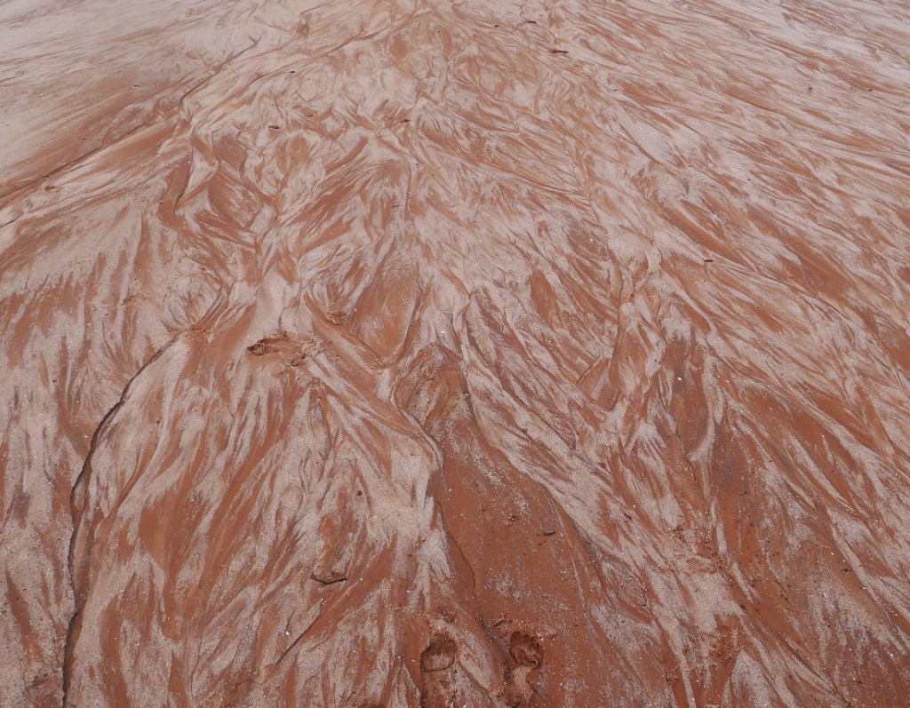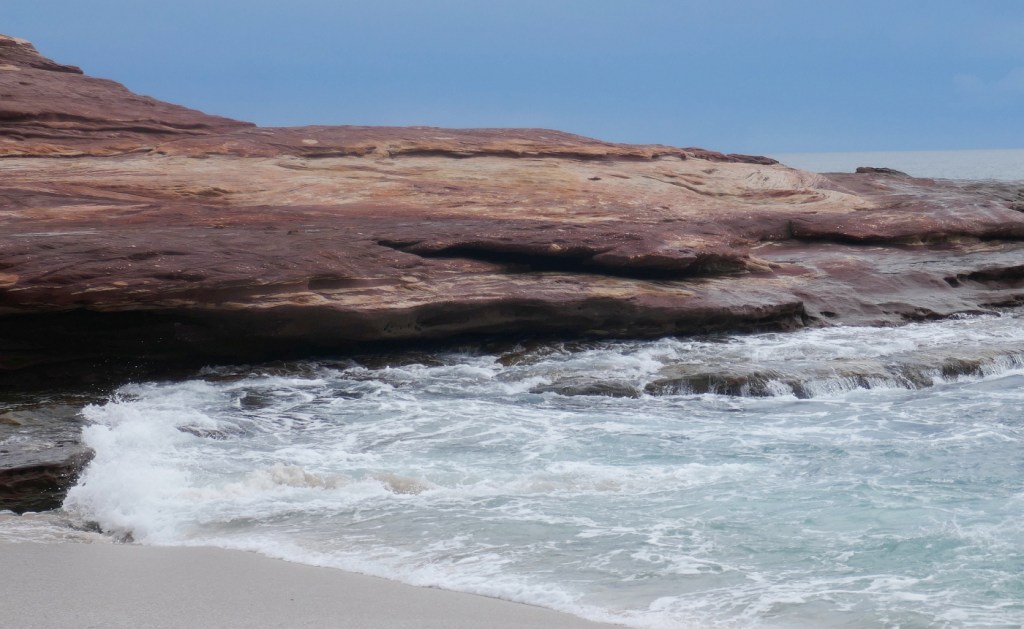 I have never seen colours in the sand like those we encountered at the back of the narrow beach here as can be seen in the image below right. It didn’t look like a swimming beach to me as the swell surged into the cove at an angle to the beach, smashing against the left side of the small headland; I am not sure how you would get off the wave before you hit the rocks.