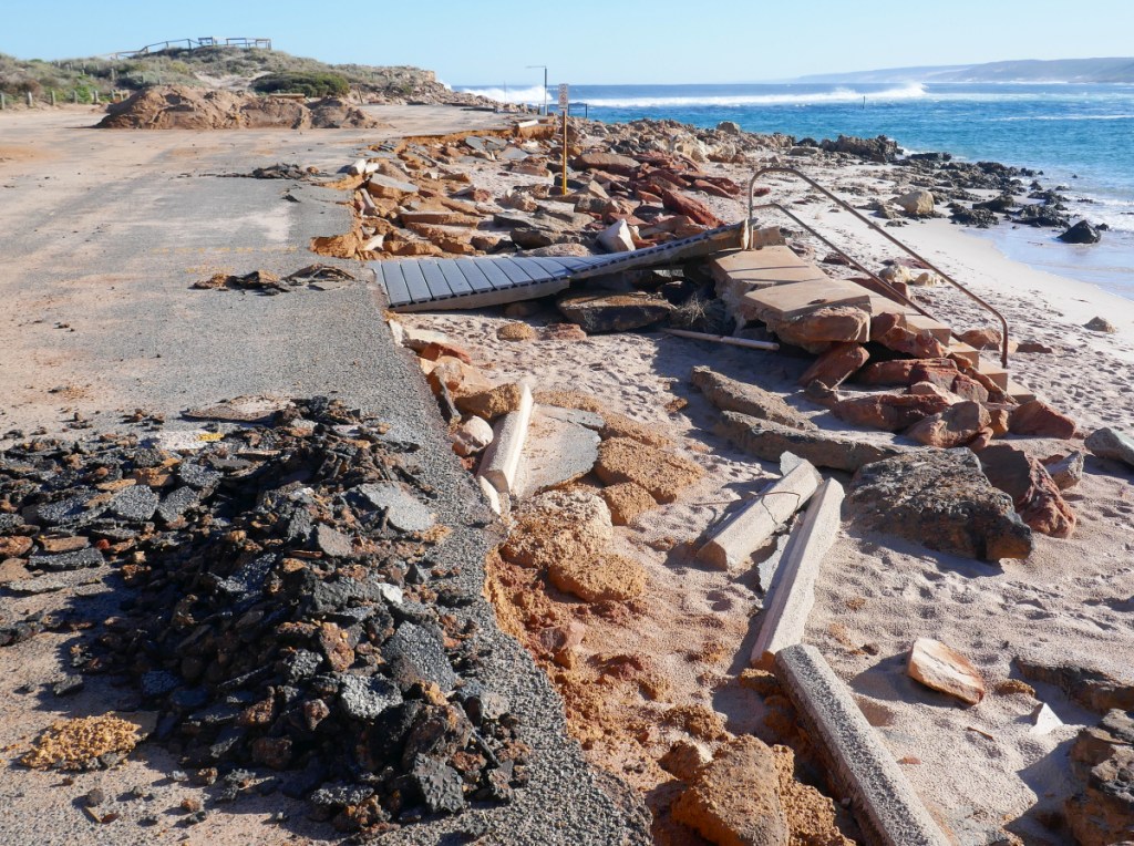 I am in the habit of starting these blogs with a map of the route to our next stopping place along the Western Australian coastline. This is the first time I have used a weather forecast map to illustrate such a journey. The trip from Denham to Kalbarri was probably one of the easiest trips of our holiday and we arrived at Kalbarri in the early afternoon after the 374 Kms drive. However before our holiday we thought we might have to leave Kalbarri off our list as it sat directly in the path of Cyclone Seroja in April. This devastating cyclone had started off terrorising Indonesia and Timor and statistics at the time had recorded over 100 people had died in these countries as a result of cyclonic winds and rain. The cyclone drifted out into the Indian ocean before barreling back to the Australian coastline with Kalbarri directly in its path. It passed just to the south of the centre of town and it caused havoc in its passage. The town was closed down for a couple of weeks but when we arrived on May 17, it had opened up again, but the scars were still very evident in all parts of the town. The images below of damage at Chinamans Beach are just one example of the evidence of the cyclone’s destructive path through Kalbarri