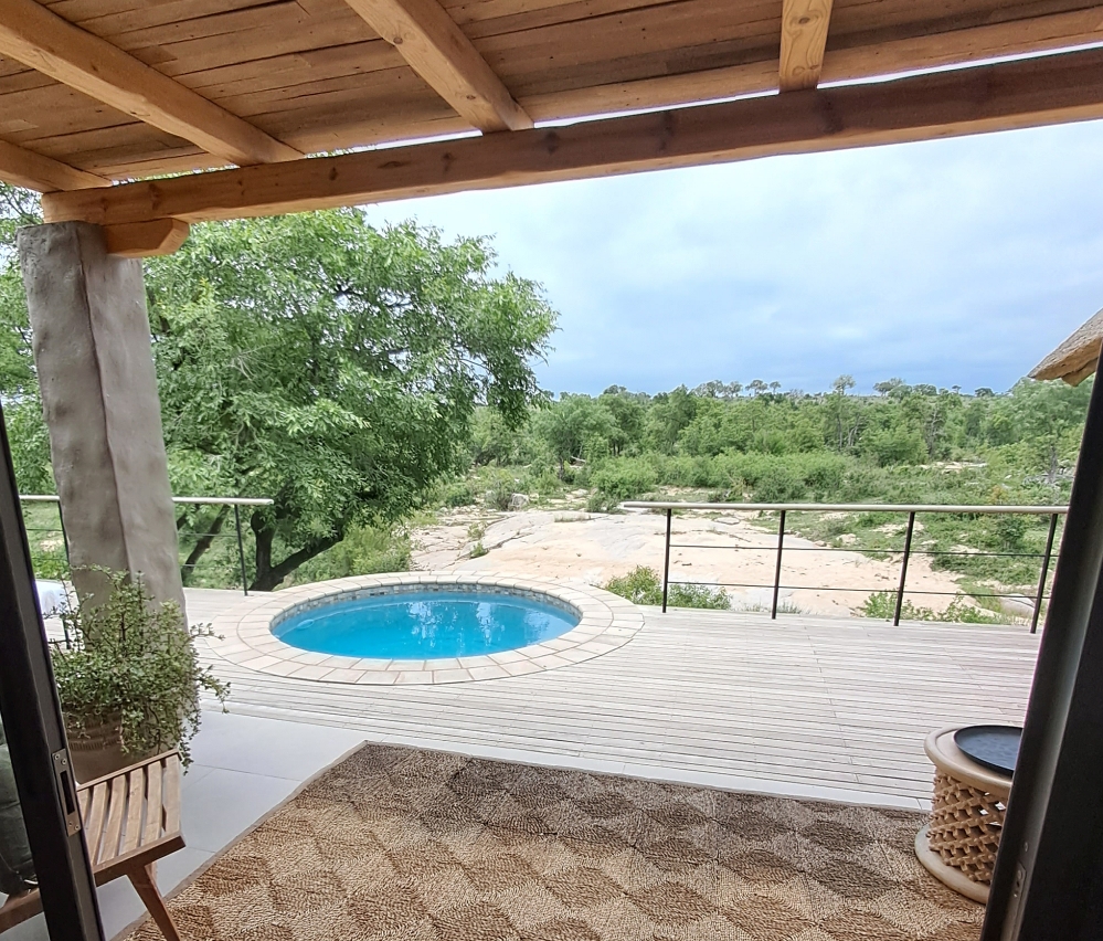 We were welcomed by our driver for the next three days as well as our hostess who kept us fed and watered over our stay. We were due to go out for our first drive after lunch so in the meantime we were led to our gorgeous accommodation (images below) to settle in. Our ‘Cabin’ sat at the edge of the Sand River and the water was quite low at the time of our stay. This meant that the banks of the river were a pathway for the roaming animals that were passing up stream.