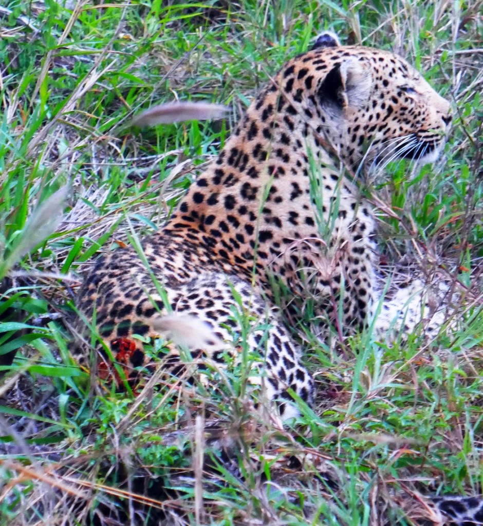 On the previous afternoon we had tracked a leopard who our guides thought might be interested in a large herd of Cape Buffalos who we had spotted the previous day. Unlike the Lions and the wild dogs, the leopards don’t hunt in groups so if their prey is Buffalo, they only attack juveniles or incapacitated adults.