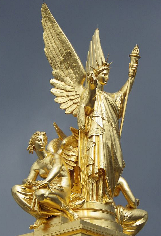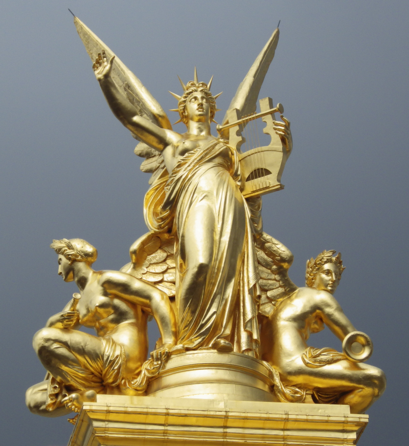 Being in the travel trade, we were lucky enough to get a complementary room in a hotel just over the road from Palais Garnier for a few nights in 2016 and I have to admit to spending a lot of time admiring its façade. The two photos on the left below of the golden figures of ‘Harmony’ and ‘Poetry’ from the roofline of the opera house are thanks to this great viewing position. The image on the right represents ‘Lyrical Drama’.