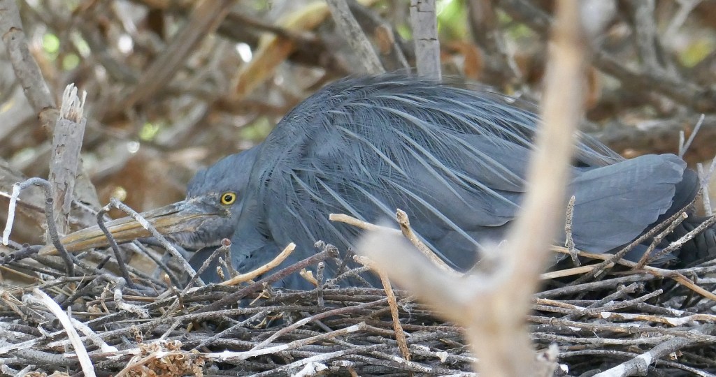 I had noticed a white Heron strolling the lagoon the previous day but our guide for our morning walk took us to another large Octopus Bush and pointed out a nest containing a grey Heron, clearly sitting on her clutch of eggs. I asked whether the white Heron from the day before was linked to this bird and was told they were a breeding pair; different colours in the same bird species is called dimorphism. These birds are called both the Pacific Reef Heron or the Eastern Reef Egret and are found throughout southern Asia and Oceania.