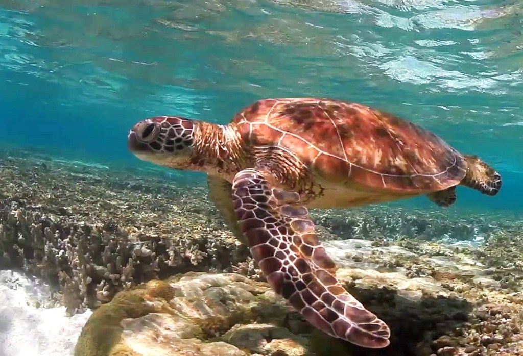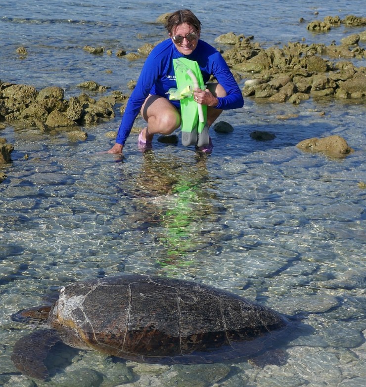 Perhaps our best encounter was on our last morning after an early snorkel. We walked around the end of the Island along the crushed coral beach and came upon a turtle in the shallows. The huge creature was sunning itself in a rock pool at the edge of the lagoon. It made our morning and convinced us that we had enjoyed three delightful days on Lady Elliot Island and made us determined to return in the future with family.