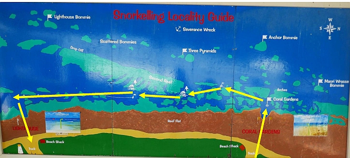 Although our bird neighbours kept up their chatter most of the night, we decided we didn’t need ear-plugs and a great sleep was had, presumably our previous day had exhausted us. Our Sunday was a big snorkelling day as this was the day we would snorkel along the western side of LEI, using the guide ropes that the resort had installed, attached to buoys that led swimmers along a journey above the reefs. These were great as they instilled confidence in less confident snorkelers as well as giving seasoned types a chance to hold on and relax. The poster below gives a pretty good idea of the process…all the snorkelers had to figure out was which way the current was running.