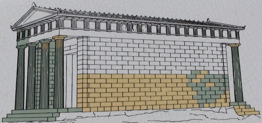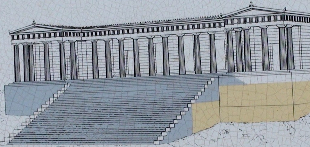 The ritual buildings to honour Athena were set out in front of the temple in the form of a grand entrance way (Proplyea) and a large Stoa (covered walkway or portico) for public gatherings and markets. The grand staircase in the image below led up to the Stoa and the grand entrance. These steps would have provided worshippers great views out to sea and down to St Paul’s Bay as they looked east.