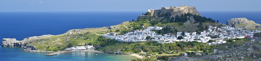 On our second day in Rhodes we organised a hire car and drove half way along the east coast of Rhodes to visit the village of Lindos and its associated craggy headland. There are a number of reasons for tourists on Rhodes wanting to visit Lindos. There is of course the local beaches and conveniently there is a beautiful beach on each side of the headland. The town of Lindos is a beautiful Greek town to wander through but our main target was to get up to the top of the headland where the views are magnificent and the remains of thousands of years of Rhodes history can be explored.