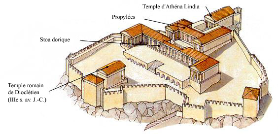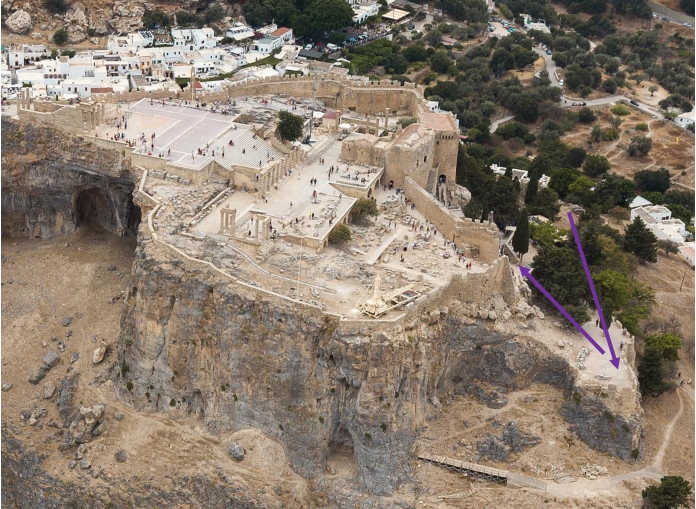 We know that Lindos is a few centuries older than Old Rhodes Town and evidence of Mycenaean people arriving here has been found. However records suggest that Lindos was founded by Dorian people who began moving southward for whatever reason from their homeland in northern Greece. This movement began around the 10th century BCE, bringing with them that history changing material; Iron. Over the centuries they settled in large areas of Greece as well as sailing out into the Mediterranean, settling in places like Gortyn in Crete and Lindos on Rhodes. The aerial view of the Lindos Acropolis below illustrates what an amazing defensive coastal position this escarpment was. The crag was way above the landscape so perfect for the worship of their Gods as well as making an almost impregnable fortress when attacked by envious sea-faring neighbours.