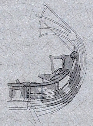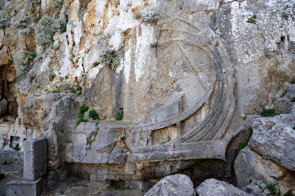 The relief served as the base of a bronze portait statue of Hagesandros son of Mikion, whom the Lindians honoured on the occasion of a naval victory of the Rhodians. The stern of the warship (triemolia), which preserves traces of red paint, is rendered in detail, with the aphlaston at the right end and the richly bedecked captain’s seat in the form of a bird’s wing. Discernible on the back of the base, within a small temple (naiskos), is a standing female figure with kalathos on the head. Preserved on the rock in front of the relief is a row of holes, in which were set the iron railings that protected the monument.