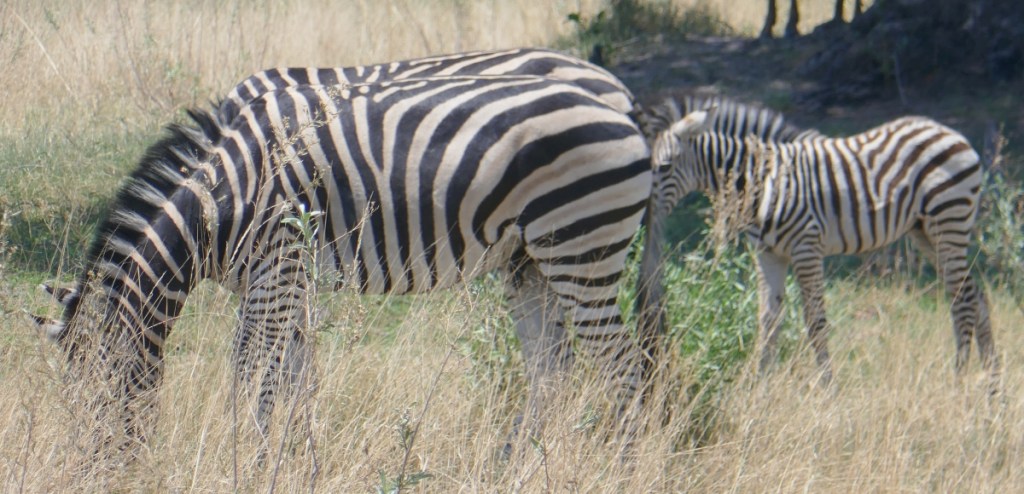 Further along from the giraffes, we came across a large herd of Zebras whose collective noun we discovered was a ‘dazzle’. Apparently zoologists believe that the Zebras use their stripes as camouflage to confuse predators. Another theory about the stripes is that they are a deterrent to biting flies. Zebras are defined as a species of ‘Equus,’ the same as horses and asses. There are three African equine species and I presume that the Okavenga Zebras were most likely the ‘Plains Zebra’.