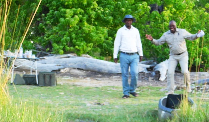 We had had a very busy morning exploring the Okavenga and given our early rise and our long drive, we were all just about ready for a decent lunch. However there was no sign of us heading back to civilization. To my concern, we even stopped under a tree with no sign of sustenance anywhere! Our guides invited us to jump out of the truck and head around the group of trees in front of us. As we headed off, the sound of singing started and there before us was a group of staff from the camp site with a large ‘spread’ laid out for us. It was picnic lunch time so we were not only entertained but fed superbly!