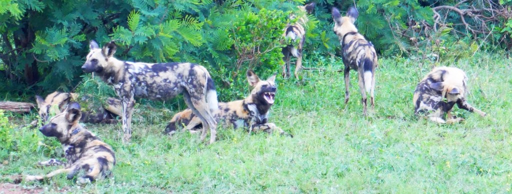 One of the aspects that became part of our Safari drives was the continuous sharing of animal information between the drivers. If lions or a leopard were spotted, the guides would share this info with the other drivers taking groups on ‘safari’. After we passed the Kudu, our driver got very excited about news of a large pack of Wild Dogs that had recently entered in the Londelozi Concession. He was told where they were headed so he took off to find them. A large group of wild dogs meant they were probably hungry and would no doubt be hunting in the late afternoon. These ‘Wild Dogs’ have many names…Cape Hunting Dogs, the Painted Dogs/Wolves and the African Hunting Dogs. When we arrived at where these dogs were relaxing after their afternoon nap, we found that there was a large group and our guide made the judgement that they were starting to get ready to go hunting.
