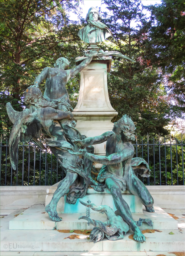 We have visited these gardens twice on trips through Paris and both times we have entered via the north-east gate. Just along this path is a vibrant sculpture and fountain dedicated to the memory of Eugene Delacroix (1798-1863), often described as the leader of the French Romantic school of painting in the 19th century. Delacroix’s bust with wind-blown scarf (image on right above) sits at the top of the sculpture with three bronze statues of the allegories, Time, Glory, and Genius of Arts arguing below him. It is a very interesting sculpture worth a stop to study in detail. It was sculpted by Aime Dalou and installed here in 1890. Delacroix is particularly famous for his memorable painting of the people of Paris marching behind Lady Liberty during the French Revolution (See appendix 1). Conveniently for us, some of his finest works are murals in Saint-Sulpice Church, our last stop on this itinerary.