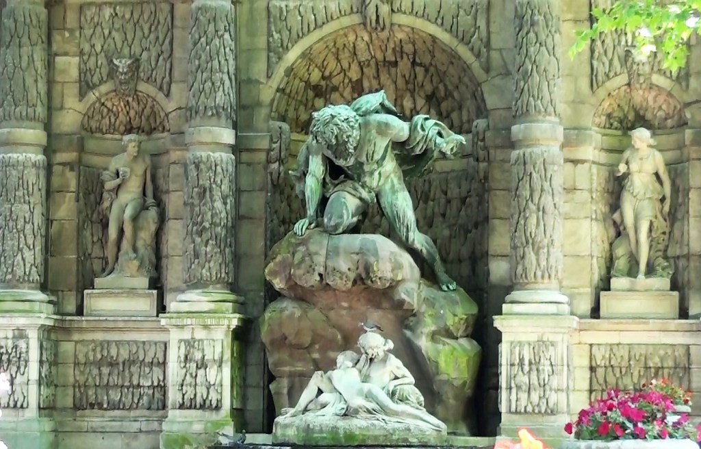 Luxembourg Park is very popular with locals looking for a pleasant day out with the family, particularly if someone in the family owns a small sailboat to launch on the pond in front of the impressive Senate building. But for me the most interesting feature of the park is the Medici Fountain, tucked away amongst the Plane trees on the right-hand side of the park. The original fountain was commissioned by Marie de Medici in 1630 as a Nymphaeum, an ancient Greek concept for a grotto built around a spring dedicated to water spirits (nymphs). Two centuries later it had fallen into ruin and was restored in 1811 under the orders of none other than Napoleon Bonaparte. It was moved to its current position in the 1860s and the long basin was added as well as sculptures retelling the Greek myth of the lovers, Acis and Galatea, being disturbed by the jealous giant, Polyphemus. Acis is killed and of course transformed into a water nymph by Galatea.
