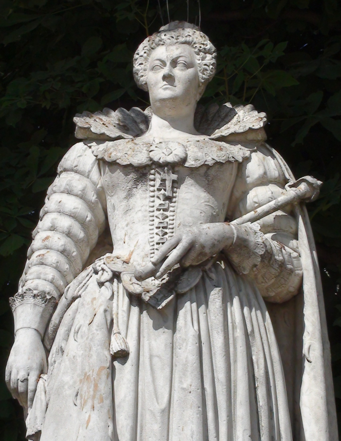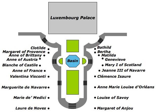 The image on the left above is of Marie de Medici; it is her statue amongst the 20 other statues of Queens and famous women of France, erected around the formal gardens and the large pond in front of the Palais de Luxembourg in the 1840s. Not all the women commemorated here became queens of France. Margaret of Anjou became a queen of England and Mary Stuart (Mary I) became queen of Scotland with unfulfilled hopes of becoming the queen of England. A statue of Joan of Arc from 1852 was placed in this collection but was considered too fragile to remain outdoors and was moved to the Louvre in 1872.