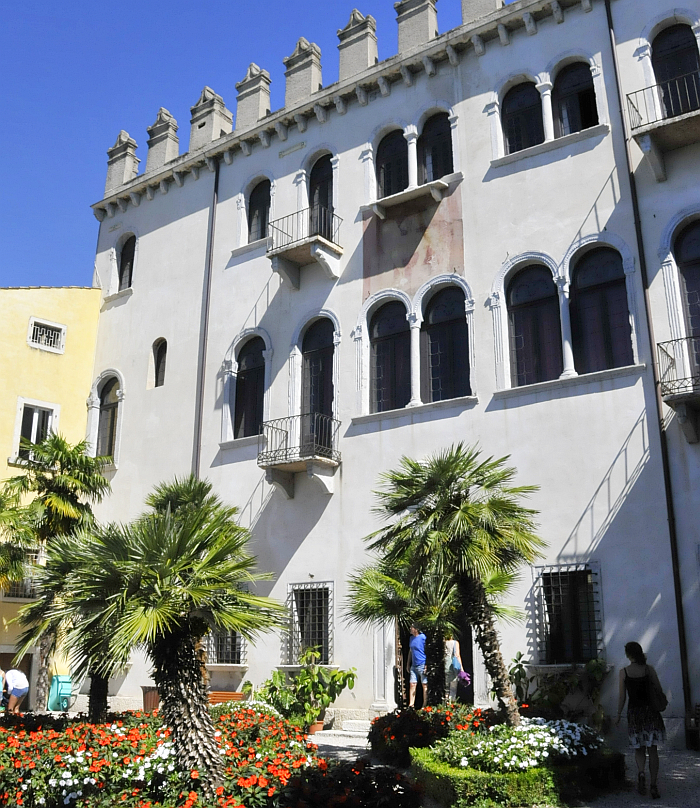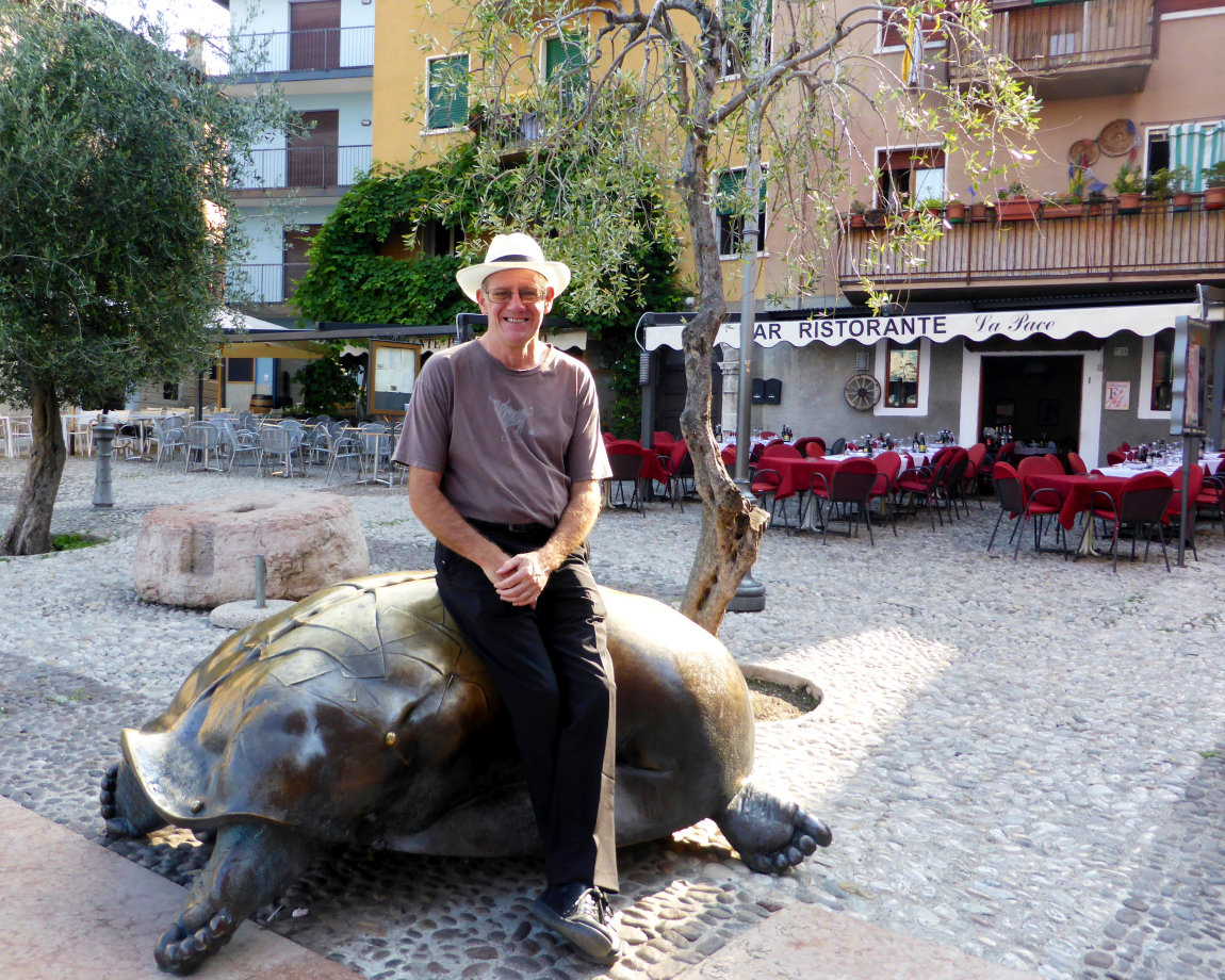 While our tour around Lake Garda took us to many places, we had a number of days when the daily tour didn’t start until later in the morning when we had time to stroll Malcesine. Being a lake side town, there was a lovely walk along the waterfront as well as among the alleyways. The image on the left below indicates the slow place in the town’s piazzas, but the tortoise was a surprise feature, I have never seen a tortoise with human feet before. The building on the right is called Palazzo dei Capitani and was constructed by the della Scalla family sometime in the late 13th century. It has done amazingly well to survive almost seven centuries intact and today is a National Monument and houses the local library as well as exhibitions and other local events.