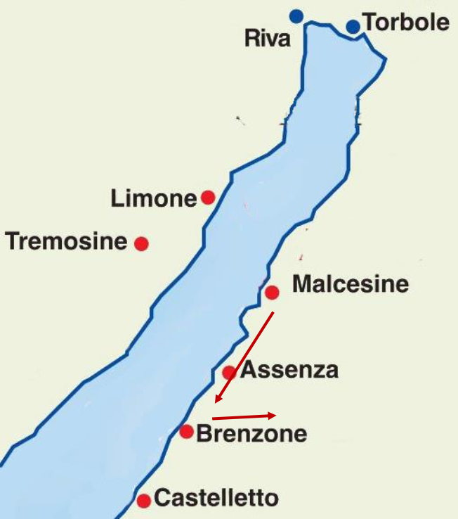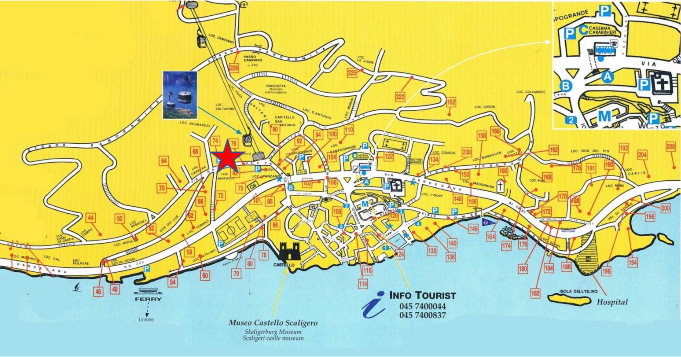 We had had a very long day of sightseeing on the previous day but that didn’t stop me from getting up early and checking out the views from our Hotel verandah. Hotel Meridiana is marked with a star on the map of Malcesine below and the photo to the right confirms that the castle by the lake was part of our view for many days. It was our base camp for visiting towns at the top of the lake and on the western side of Lake Garda but we did spend a fair bit of time checking out the country in and around Malcesine.