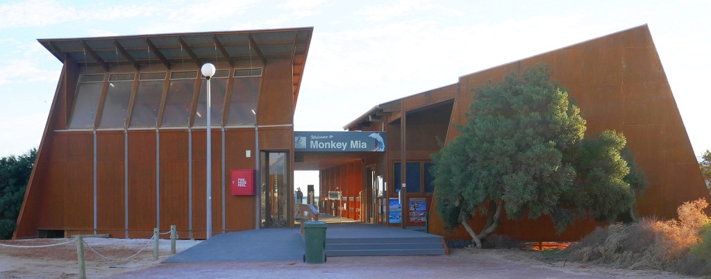 After avoiding the wallaby family crossing the road as we left Denham, it was only a 20 minute drive across the peninsula to Monkey Mia. We were visiting this resort famous for its daily feeding of the wild dolphins, the first daily event being around 8am. This practice began in the 1960s when fishers began sharing their catch with the dolphins. The practice continued over the years and more dolphins visited as did more human visitors attracted by these beautiful creatures. Studies of the dolphins in the 1980s and 1990s revealed that the feeding practices were bad for the survival of the dolphins, the calves were not learning the necessary survival skills. Strict controls were introduced so today they control the fish feeding to only 10% of the Dolphins daily diet. The survival rate of Dolphin calves between 1995-2010 who visited Monkey Mia is 15 out of 17, the same as for dolphins who don’t visit this beach.