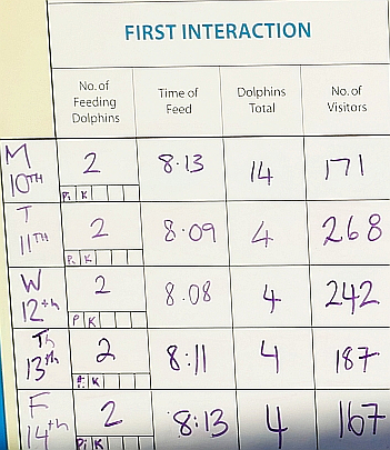 We survived the ticket gate process and found a space in the very large car-park with all the other camper vans. It wasn’t far to the the large administration block that checked our tickets as well as encouraging us to walk through the displays and souvenirs. The entry arcade through the main building led directly to a gathering forecourt where we were asked to wait until the Dolphin feeders and the Dolphins (presumably) were ready to feed and be fed. I noticed a whiteboard on the wall of this area where the administrators kept running totals of the number of Dolphins who arrived per session and the number of visitors who arrived to watch the process, For example for the last 5 days, the total for the number of tourists who came for the first Dolphin Feeding over that time was 1035…that’s a lot of customers. These statistics also showed that they record the difference between the feeding dolphins and those Dolphins who arrive just for a look. For each of the past four days, only 4 dolphins arrived and only two were feeding. It looked like a large crowd had arrived for today’s event so I was hoping for more than four hungry dolphins