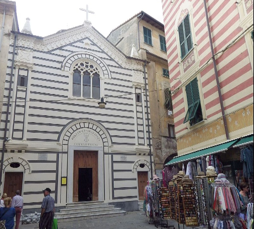 Monterosso, as can be seen in the image above, has a large beach in front of the town, unlike the rocky sea-fronts of the other towns along the Cinque Terre. As a result, it is very popular in the summer months with tourists. At the back of the beach-front esplanade, there are plenty of shops for the visitor to inspect. Here can also be found the local parish church of St John the Baptist built between 1282-1307. It can’t be seen clearly in the photo on the right below but there is a lovely painting over the front door of the Baptism of Christ. In the photo of the beach front further down, the bell tower of the church can be seen towering over the village. This tower was originally designed as a watch tower. The Cinque Terre towns were a regular prey of coastal pirates so watch-towers were very important for the villagers’ protection. At one point in its history, Monterosso had 13 such towers but today only 3 are left. On the walk out of town towards Vernazza, the Aurora Tower can be seen on the headland. (See bottom of photo above).