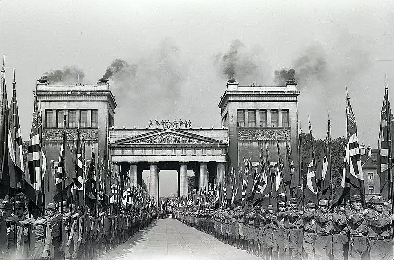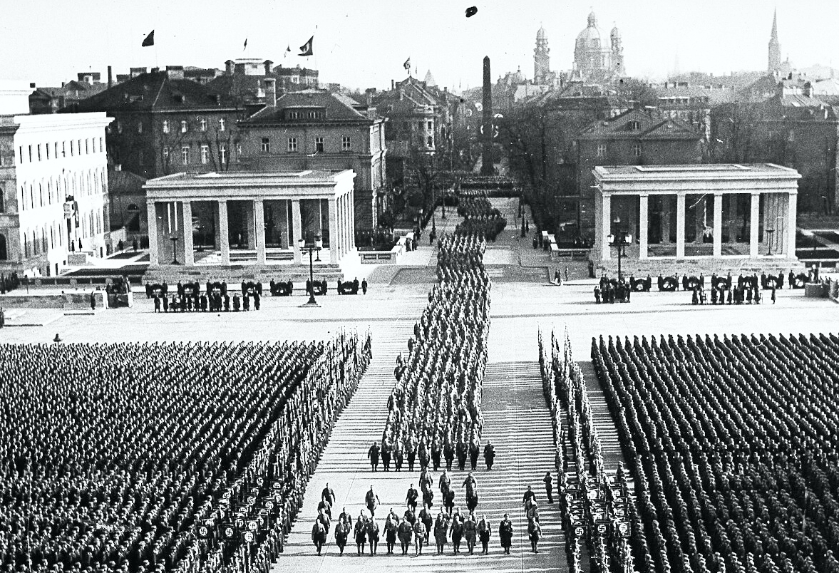 Below are two photos that illustrate the use of Konigsplatz both before and during the war. The image on the left below shows how the NAZIs used the Konigsplatz as a marching zone to celebrate their political victories. King Ludwig I must have spun in his grave with the use they made of his hallowed Propylaea. Ludwig’s Greek-style gate still stands but the two other buildings that the NAZIs added to this area can only be traced by the remnants of their foundations. These two buildings, the Honour Temples (Ehrentempel), can be seen in the photo on the right below and were built in 1935 to house the coffins of the 16 NAZIs who were killed in the failed Beer Hall Putsch of 1923. The photo illustrates the pageantry involved in NAZI memories of the Putsch which impacted on so many locals during the war. The Italian Dictator Mussolini (image on right) must have felt very honoured (or very confused) when he joined Adolf Hitler at a parade honouring the ‘Blood Witnesses’ of the 1923 Putsch.