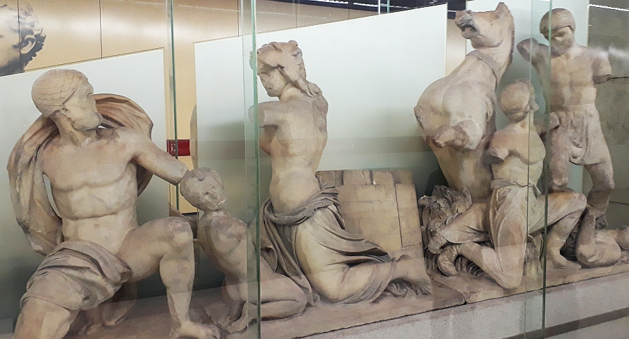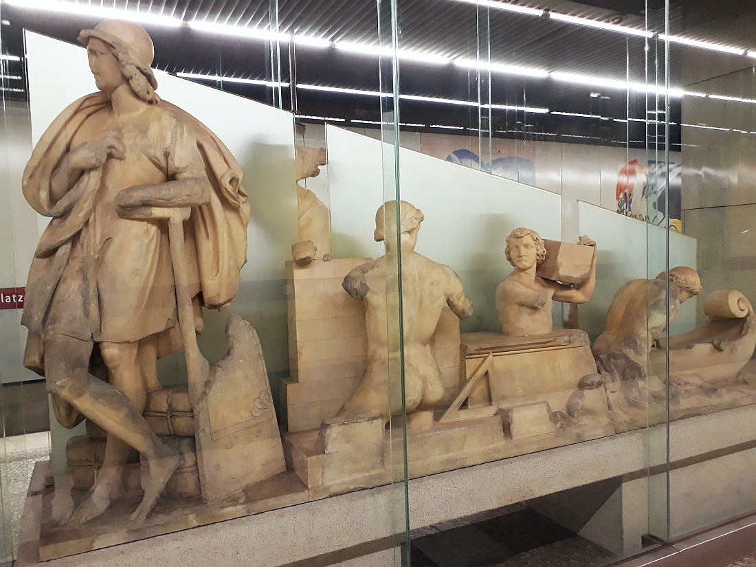 To suggest a visit to a railway or tram station (apart from the purpose of catching public transport) as part of a sightseeing tour is surprising. However, if you are like me on an early morning walk in 2018, you will be stunned when you see what’s on the platforms and walls of this station, without even the need to buy a ticket. I suppose that because this station is an arrival point for those visitors checking out the museums of the district, perhaps the planners of this station (opened in 1980) decided that a foretaste of the Greek Art available above ground here was a good idea. The examples from this station shown below are of course facsimiles but I suspect these display cases are a better alternative to the tedious adverts that generally line railway station walls!!