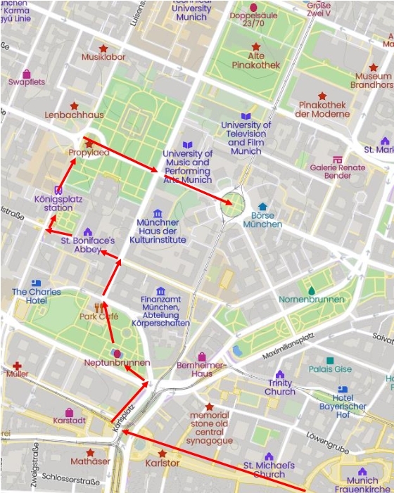 However a beer festival parade will not occur when most people come to visit Munich so a normal visit to Karlsplatz will not involve beer festival attractions. Checking out Karlsplatz is the first thing to do and then my suggestion is to follow the arrows on the map to the right that lead to Koningsplatz Station.
