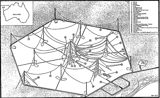There was one curious sight between Exmouth and our caravan park which puzzled us greatly when it first came into view. It initially looked like a huge number of extremely tall aerials gathered in a circle, its purpose beyond us. It was in fact the U.S. Naval Communication Station named after the late Prime Minister of Australia, Harold E. Holt. Its purpose is to communicate with submerged submarines. The road down the coast took a swerve around the Communication Station and our drive took us another 15 minutes before arriving at Yardie Homestead Caravan Park.