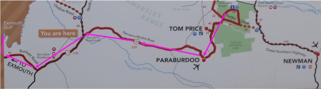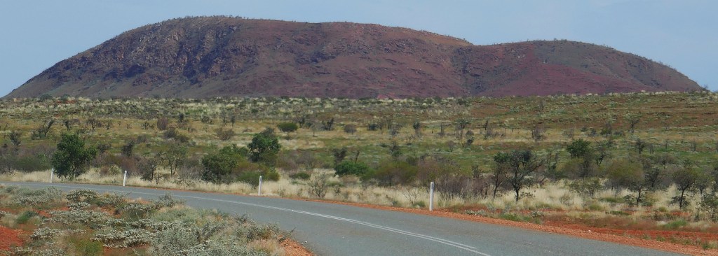 Travelling the Western Australian outback by motorhome is undertaken knowing that there are long distances involved in driving by road between major towns. After we had finished our five days at Karijini National Park, we knew we were in for a long day’s drive from the Eco Retreat to beyond Exmouth to our next Caravan Park at Yardie Homestead. Our first destination was Paraburdoo which is a modern town that services the mining towns further north-west. It has an airport to where both workers and tourists fly in to head to Karijini or Tom Price. We stopped for coffee at the pleasant modern town centre but this was the last centre of civilization for the next 400 kilometres or more. The only stopping point on the road to Exmouth was the Nanutarra Roadhouse, 270 Km from Parabardoo and then another 277 Kms to Exmouth. The length of travel times is a necessary evil but I was surprised at how interesting the scenery was along the Nanutarra Murjina Road before we joined the North West Coastal Highway. The mesa below was was just one of the many gorgeous panoramas that we passed on our long day’s drive.