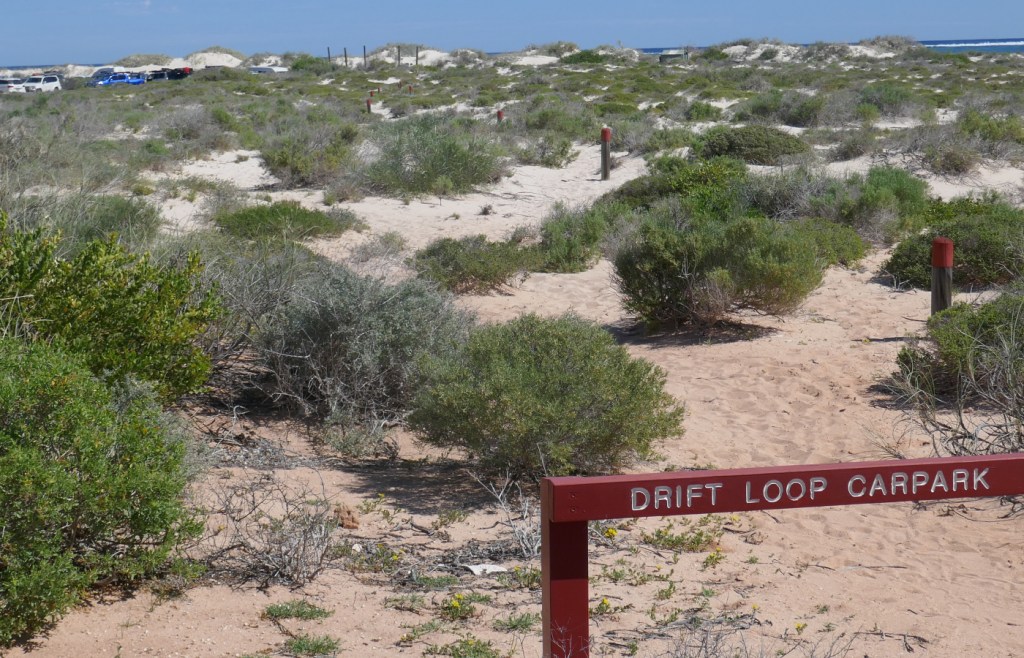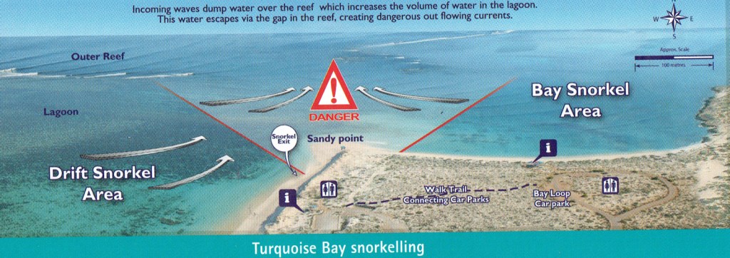 From Oyster Stacks we drove back up the road to Turquoise Bay. This is a complex location having two beach areas meeting at a point as shown in the photograph to the left. There is a gap in the reef not far from the shore where the two beaches meet and as the diagram below illustrates, the water rushes out of the lagoon here, causing a current that runs along the ‘Drift Snorkel Area’. Snorkellers need to watch their movement along this beach and be ready to exit onto the sandy point. Folk who just want a day at the beach generally choose to stay on the northern side of the sandy point.