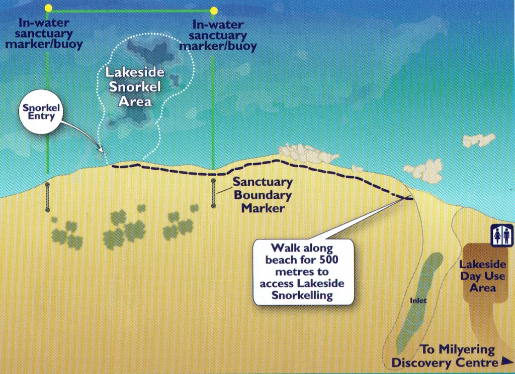 The disadvantage of Lakeside was that it was a long 500 metre walk to the start of the snorkeling area. The map below from the Visitors Guide shows the journey but doesn’t illustrate the long rocky sections adequately where ageing knees and feet have to rock-hop nervously along the water’s edge; it was a walk for the younger version of myself.