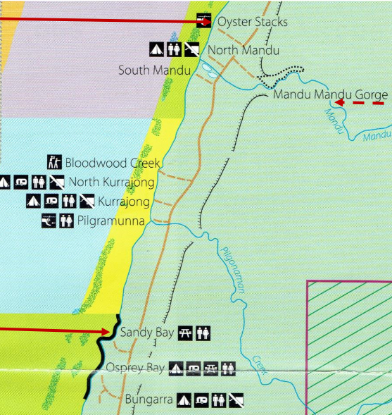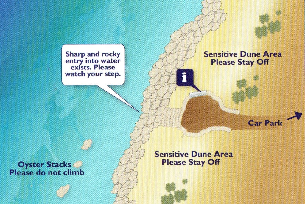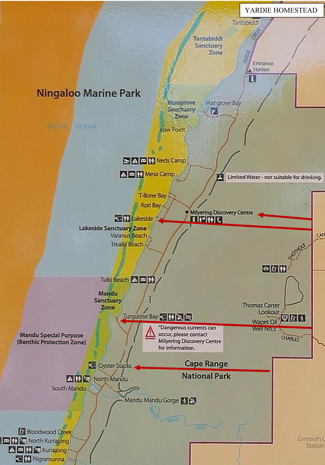 Oyster Stacks is a different style of snorkelling site from the other beaches we visited over the two days. As can be seen by the diagram of ‘Oyster Stacks’ below (taken from ‘Ningaloo Coast Visitor Guide’), the entry into the water is across a rocky foreshore that is very hard on the feet. This site can only be snorkelled at high tide but is worth it as the rock stacks create an environment that attracts a lot of marine life. The geography of this place is also very different from other dive spots along this coast as the “Guide’ explains… “Oyster Stacks is unique with the lagoon being at one of the narrowest sections along the whole Ningaloo Coast. The outside reef is only 300m from the shore giving this area a concentration of corals and other marine life.”