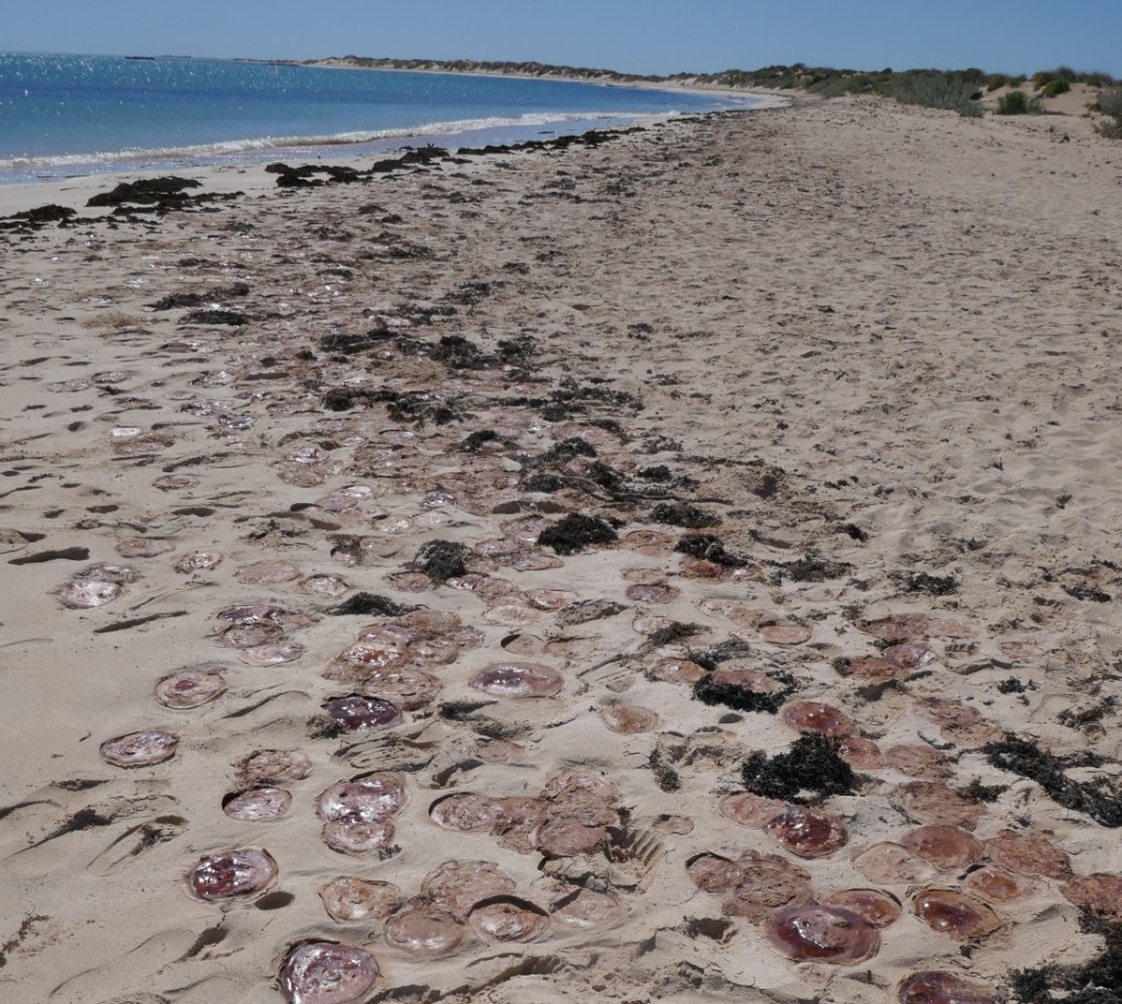 Turquoise Bay is not misnamed; it is a lovely beach area where the water is definitely turquoise. We enjoyed this spot so much we visited it again on our second day in the area. There are two car parks here and on both days we did the ‘drift loop’ a couple of times before enjoying the walk to the northern rocky end of the beach. The only annoyance about snorkeling at Turquoise Bay over the two days was caused by a natural phenomenon. For reasons unknown to us, there was a huge boom in the local red jelly-fish numbers and on the first day, the water was full of them and if you weren’t careful where you were snorkeling, you could get a nasty sting from the tentacles. By the time we left from our first visit, the declining tide was depositing the jelly fish on the beach as the photo below shows.