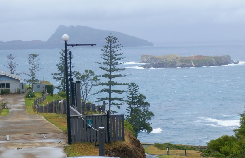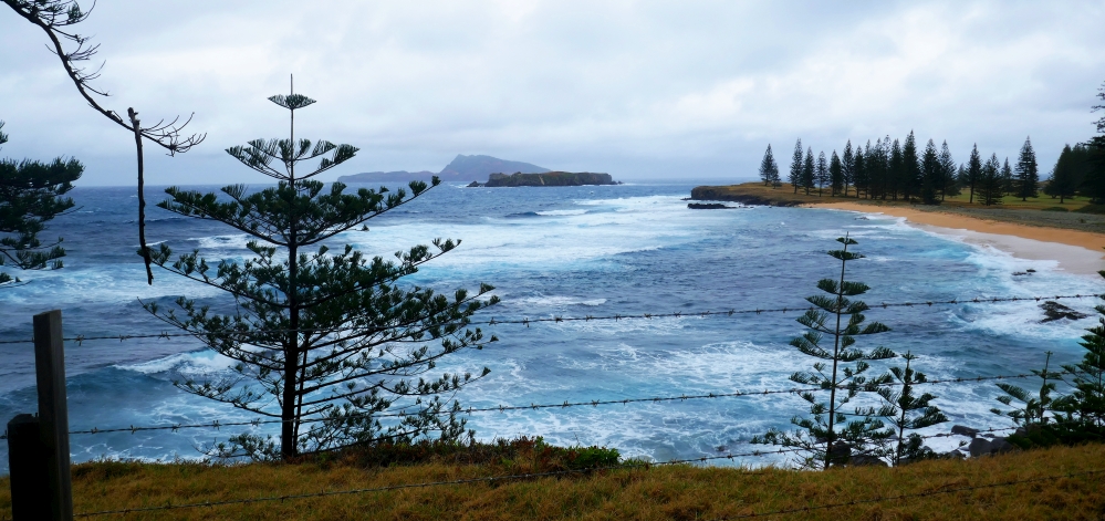 After another excellent night’s sleep in Governor’s Lodge Resort, we decided we would do a slow inspection of the buildings in the Kava Heritage area that we had not yet had time to visit. By this stage we had discovered that there were four main roads down to Sydney Bay and we decided to use the Collins Head Road and on to the Driver Christian Road to get us down to the far end of the southern coast of Norfolk Island at Cemetery Bay. Half way down the hill we decided to stop to take in the view looking out to Nepean and Philip Island as can be seen in the image below