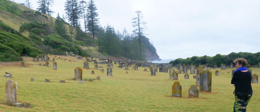 Our second destination of the morning was the Norfolk Island Cemetery. It’s a rare thing to visit a 200 year old cemetery with gorgeous mountain views and at the far end of the cemetery, a great view out to sea. We were told that the attractiveness of the cemetery’s position causes some travelers to decide that this is where they would like to spend eternity. The folk running the cemetery can arrange this.