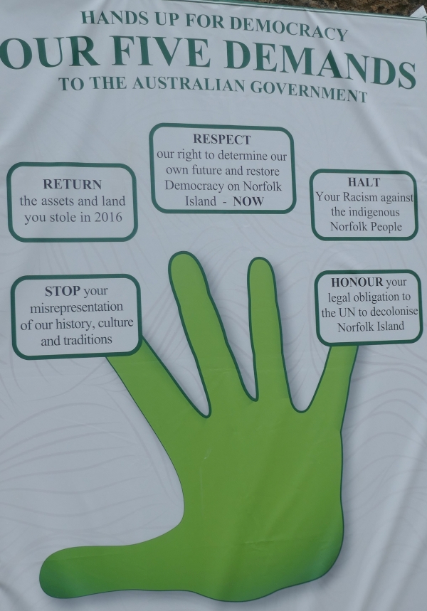 In between the Military Barracks there is an empty block of ground the is referred to as the Parade ground. The Old Military Barracks is set inside very high stone walls and consists of three fine Georgian buildings. They were built between 1829 and 1834 and they originally contained Officers’ Quarters, Soldiers’ barracks and a hospital, In the 20/21st centuries these buildings have housed the Norfolk Island Legislative Assembly and these days the ground floor of the central building houses the Island’s courthouse. Due to it being now a courthouse, we were not able to go inside but we couldn’t help but notice complex issues being advertised out in the enclosed yard. There was a mini-tent city set up here consisting of three tents and not a lot of activity going on in or around the tents. We had already seen signs in the centre of Burnt Pine like the green hand above that advertised the five demands Islanders asked of the Australian Government. Presumably the plan was to advertise their demands to Australian tourists who would go home and pressure their local members.