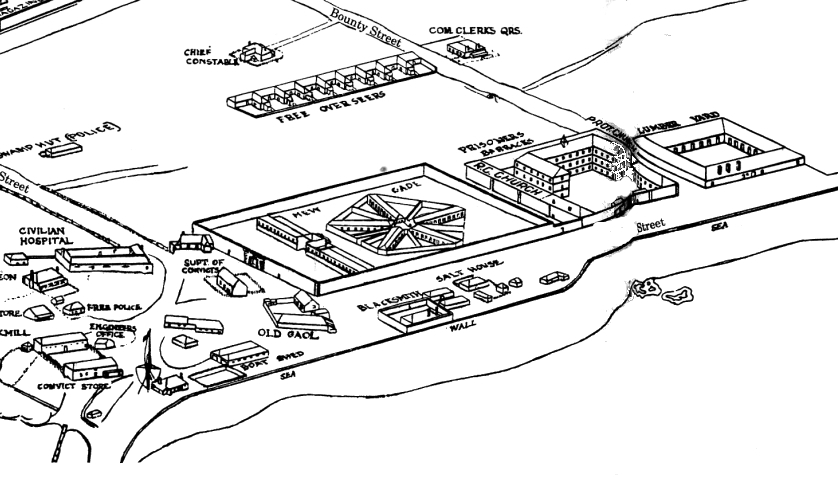 The map to the right is part of a diagram of the Kingston settlement showing the structures that housed convicts between 1825 and 1856. The map illustrates the buildings still in place in 1856 when the Pitcairn Islanders arrived. The image in the photo below left is the gaol wall that faced the hospital on the hill above the Kingston Pier. On the wall beside the entrance to the gaol (illustrated in the stamp), there is a plaque that reads… “Constructed within the walled enclosure was a gaol containing 130 cells in five radiating wings and a guardhouse. Only some ruins of the cells remain. Constructed in 1838 under the superintendence of the royal engineer Lt. Lugard. Work was halted between 1840 & 1844 while unsuccessful attempts were made to modify the severity of the design. Construction was completed by 1847 and was fully occupied by 1849.“