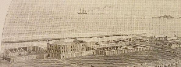 As can be seen on the map above, there is a section of the facility inside the front gate that was a cleared area in front of the main wall of the new gaol. The background image on the stamp here is a diagram of the new gaol that shows the five radiating wings of the gaol.
