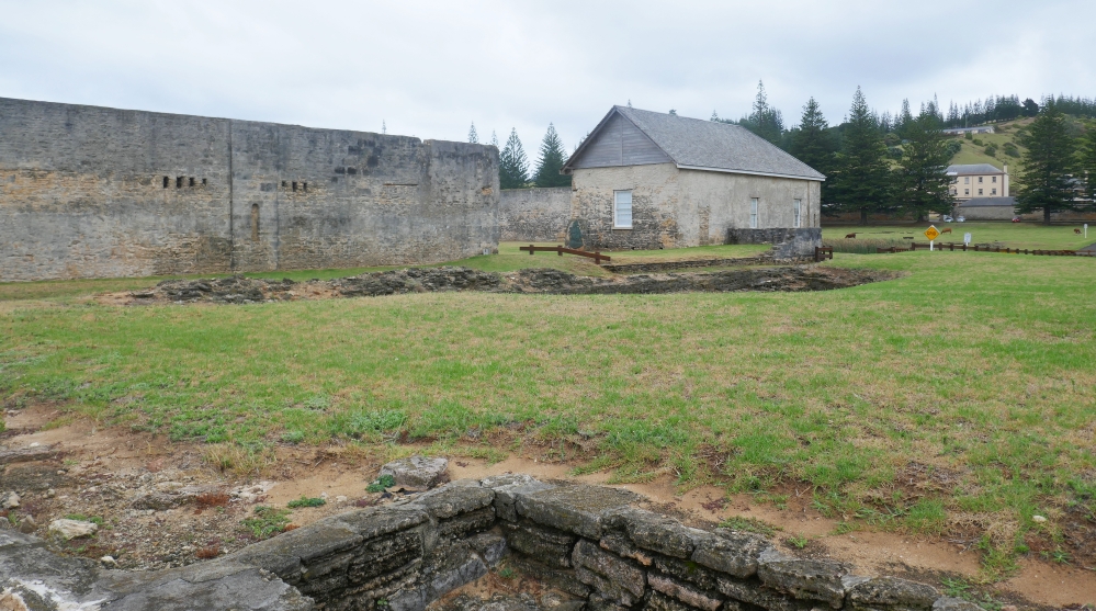 There is clearly little left of the cells of this pentagon shaped gaol to enable us gaining a reasonable idea of its layout. However when the B&W photo below was taken, an outline of the prison buildings was still in existence. The photo comes from Wikimedia without a date but the original was printed from a glass negative so it is likely a late 19th century photo. This photo makes it a lot easier to understand the design of the gaol. The plaque on the front wall tells us that the gaol was completed in 1847 so the gaol was only in use for 8 years as the convict system on Norfolk ended in 1855.