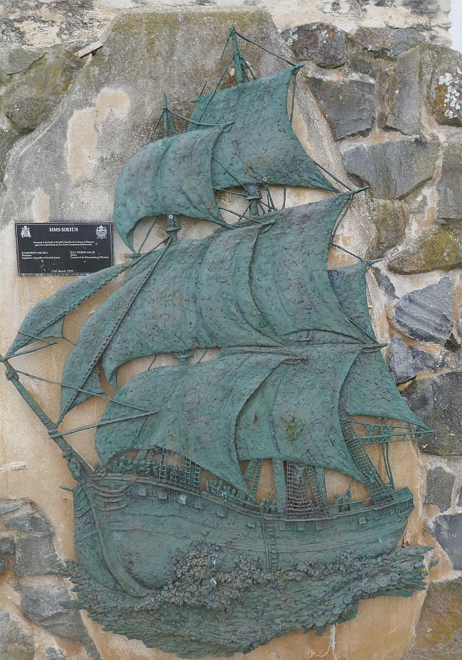 The photo below and the stamp image further down show the front wall of the original gaol and its front gate. The image above is from a drawing of the Kingston settlement sometime during the second settlement and it shows the old gaol with its roof on. The new gaol hadn’t been built by the time of this drawing. This huge walled yard today is just a flat expanse of grass without any sign of the harsh gaol that once existed here. In one corner is a small building that today functions as a museum of the Sirius wreck that foundered on the reef almost directly in front of the gate to the old gaol. The sign attached to the wall next to a bronze sculpture of the Sirius, in full sail, reads…”Presented to the people of Norfolk Island by the citizens of Mosman upon the establishment of their Sister Community Relationship…19th March 1990.”