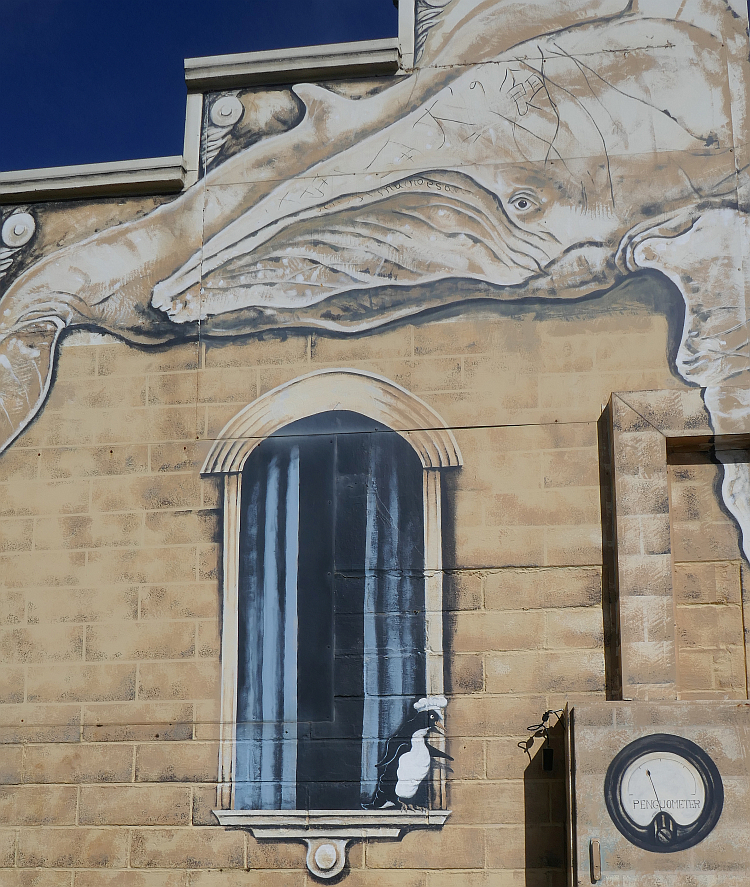 You get the sense that the locals are happy about their proximity to the penguin colony on their sea-front. Apart from the giant penguin statue, there are penguin portraits in lots of places, even on the local litter bins. I was impressed by the mural on the side wall of one of the main shops that presented whales and penguins living in harmony. An official looking penguin with a jaunty hat is keeping an eye on a ‘Penguometer’ on the wall, presumably measuring the numbers of penguins in town, not the electricity passing into this shop. An ABC news article from 2017 suggests that Penguin is one of the best places to spot the little penguins; nightly tours available from September to March