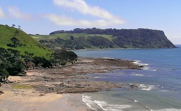 Table Cape is a vaguely circular extinct volcano with a northern face rising steeply out of the waters of Bass Strait. It is the territory of the First Nation clan, the Tommeginer people. In nearby Freestone Cove can be found ancient stone, tidal fish traps. The Cape itself was named by Matthew Flinders on his 1798 voyage with George Bass as well as naming other features along this coastline. The image to the left below shows Table Cape from Fossil Bluff, on the western side of the Inglis River at Wynyard.