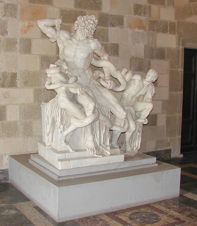 Later conquerors of Rhodes (Ottomans 1522) used the palace much as the Knights Hospitaller used it. In the twentieth century when the Italians took over Rhodes, both the King and Fascist dictator of that country used this building as a holiday residence. In 1948, Rhodes and the other islands of the Dodecanese became part of Greece and this fabulous Gothic building became a museum. You will need a good hour or more to explore this wonderful building, particularly inspecting the mosaics that are on display here. For example, the face of Medusa on the left below comes from the Island of Cos and is believed to be from the 3/4th century CE. The most famous piece of Art in this building is the group of sculptures called ‘Lacoon and his sons’. Alas this one is not an original; what is believed to be the original can be viewed in the Vatican Museums where it was placed after being dug up in Rome in 1506. The Roman writer Pliny saw this sculpture in the Emperor Titus’s palace in Rome and attributes it to three Greek sculptors from the island of Rhodes, Agesander, Athenodorus and Polydorus. So many of the Greek statues found in Rome are copies of originals that were originally cast in bronze and many believe that this Vatican one may also be a copy of an earlier bronze original. The other debate amongst scholars is whether the Lacoon is the greatest art piece of all times. I am on the side that suspects it might be!