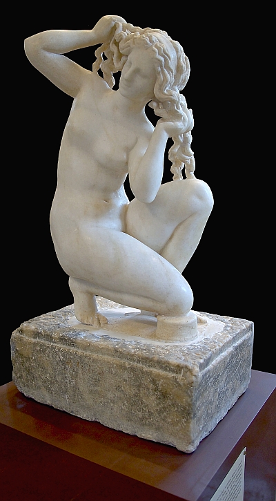 The museum houses ‘finds’ from all of the Dodecanese Islands including marble statues, urns, funerary stele, and wonderful mosaics. The mosaic on the left above is a representation of Bellerophon, the son of Poseidon, fighting with a Chimera, a hybrid lion monster that has the head of a goat on its back and the head of a snake on its tail; a formidable opponent! The gem of the museum is an original copy(!) found on Rhodes of a ‘Crouching Aphrodite’ that was inspired by the 3rd century BCE sculptor Doidalsas. These sculptures were commonly used to adorn wealthy houses and public Gardens of the Hellenistic period.
