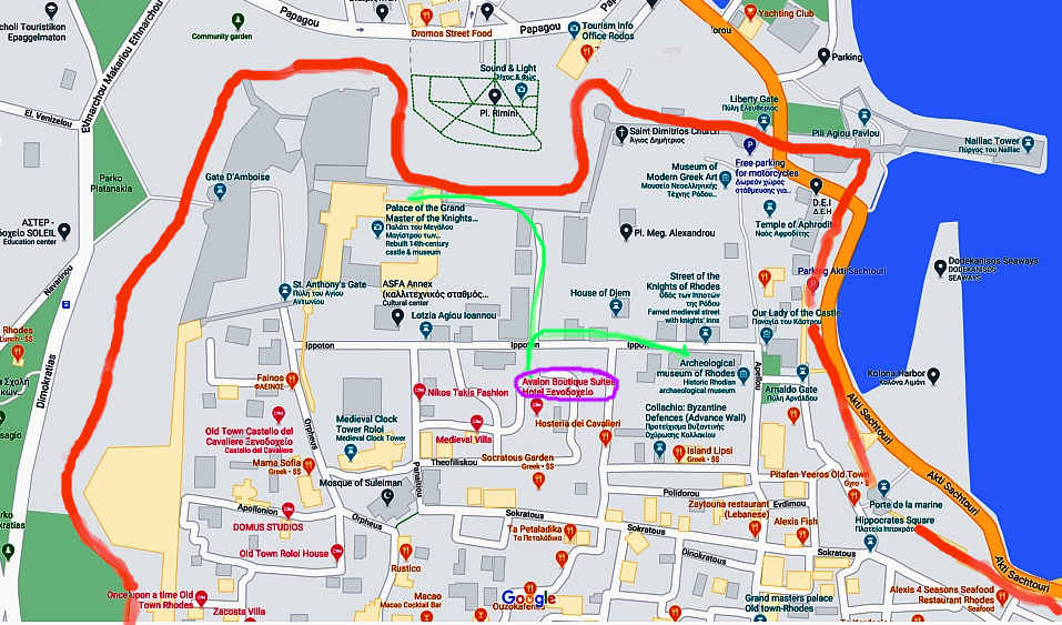 To visit the two major tourist sites of Rhodes, the Palace of the Grand Master of the Knights of Rhodes and the Archaeological Museum, we didn’t have to walk far from our hotel. As can be seen on the map above of the old town, the walk to these two major sites is very short.