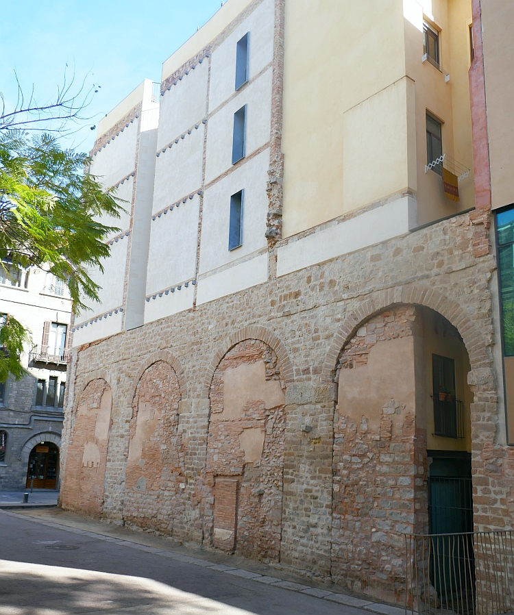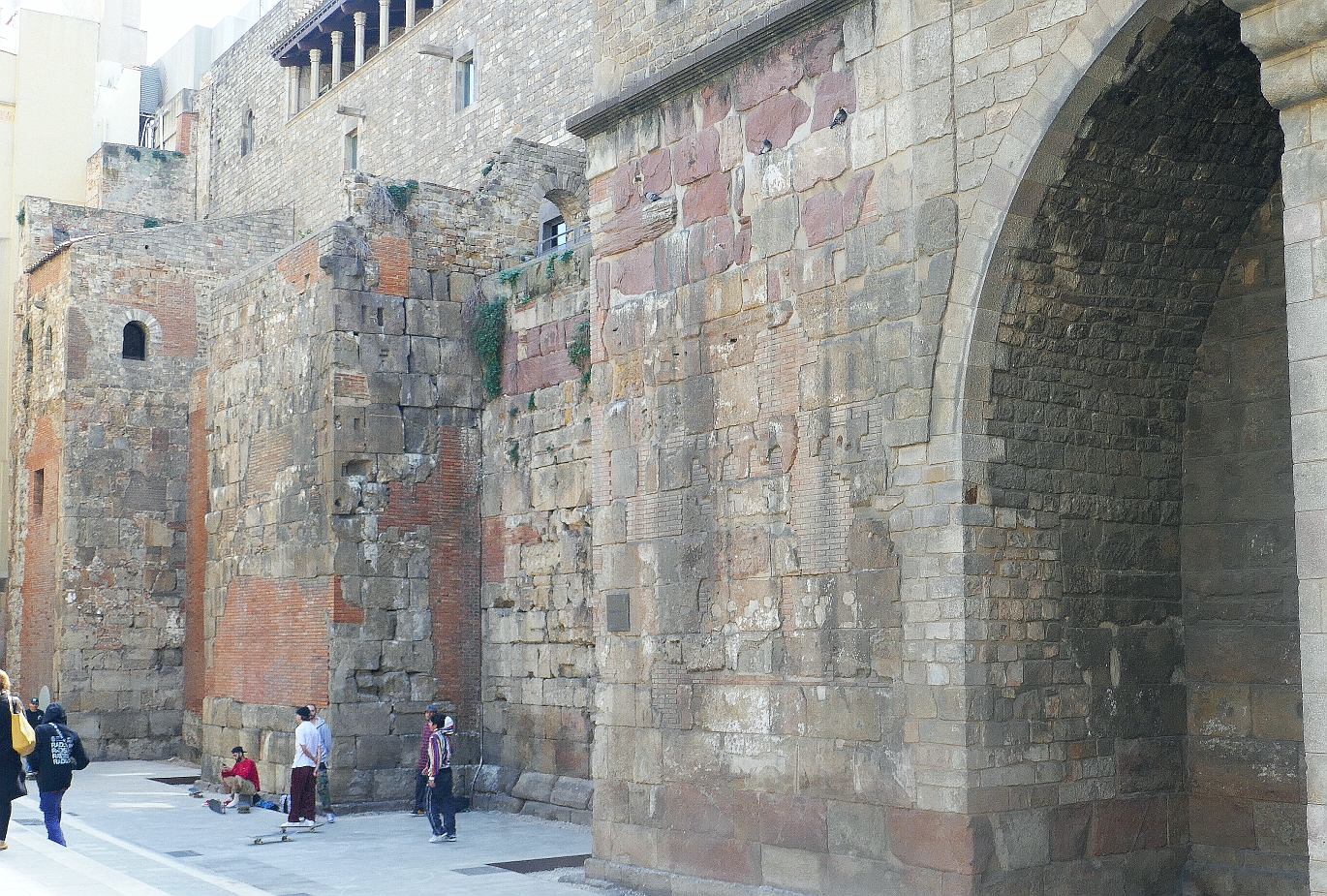 However it wasn’t the skateboarders that were the most significant features worthy of examination in Ramon Berenguer’s Grand Square, it was the stone walls the skaters were bouncing off that were the real attractions here. These walls began to be built by the Romans in the first century CE and have been reinforced a number of times over the centuries in order to upgrade Barcino’s defences against attacks by the Franks and the Alemanni (German Tribes). The conglomeration of different eras of building this wall are obvious in this significant stretch of Roman defences, parts of which are clearly constructed by materials from other buildings.